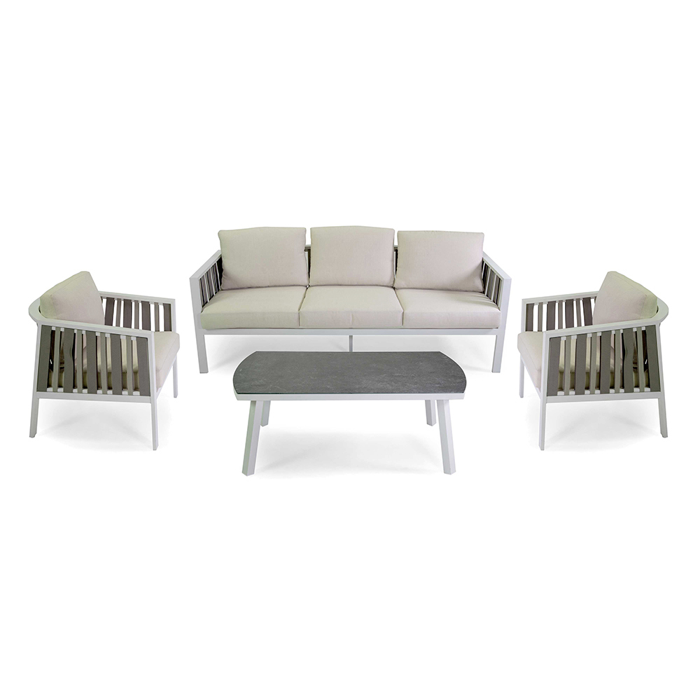 Descubra la esencia del confort moderno con nuestro set lounge de jardín , una combinación perfecta de estilo y funcionalidad . Este conjunto incluye un gran sofá de tres plazas , dos sillones individuales y una mesa de centro , todos ellos fabricados con una estructura de aluminio resistente y ligera, con revestimiento en polvo para garantizar la máxima resistencia a los elementos.
