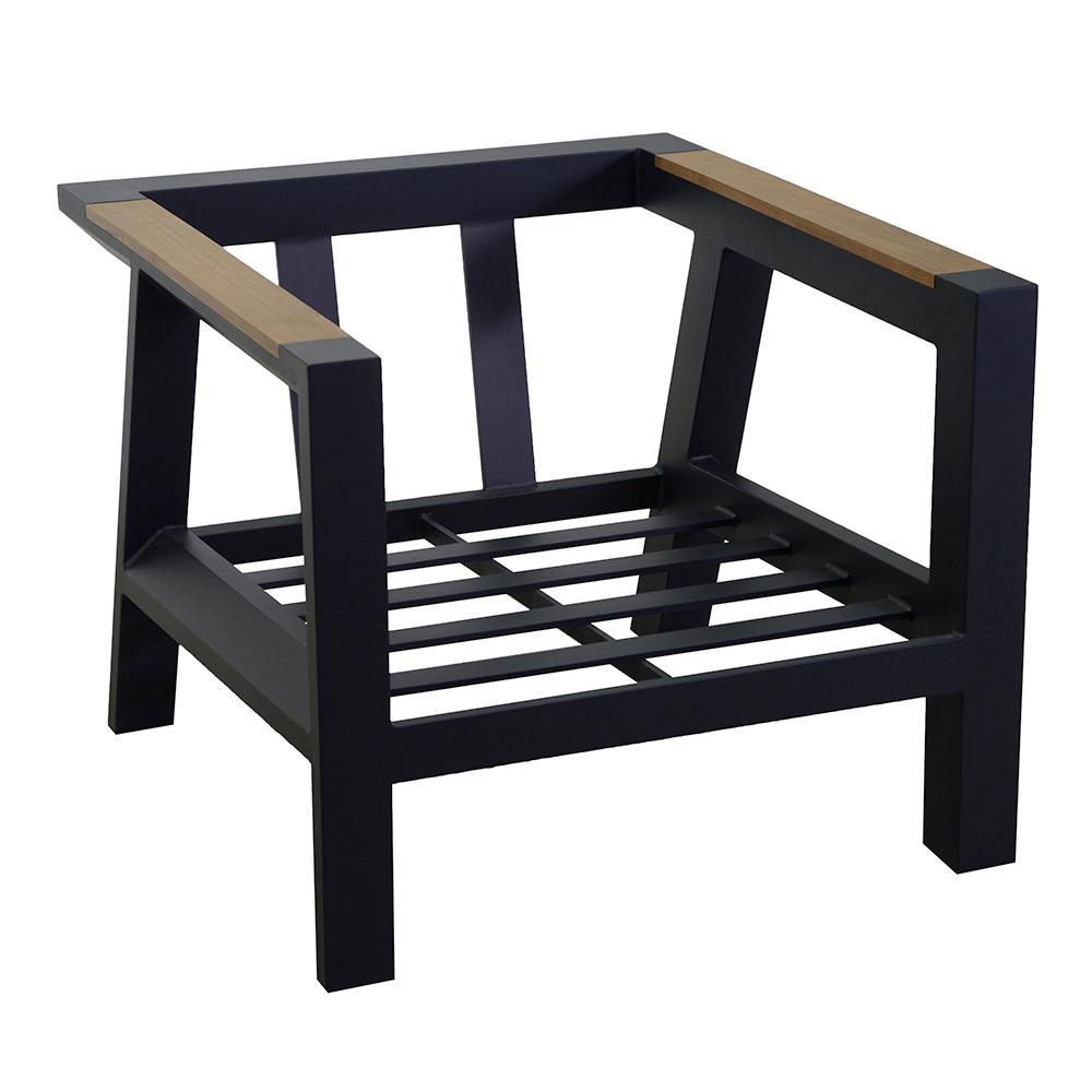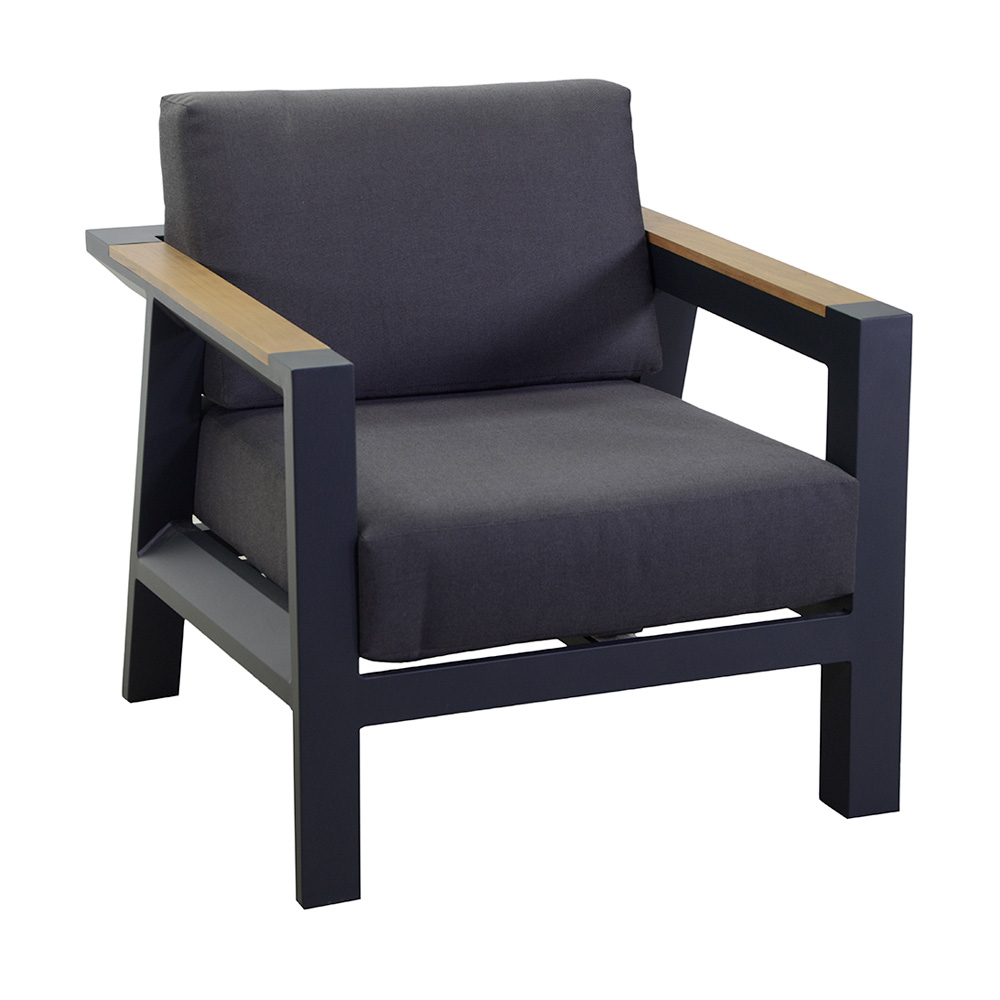 2 sillones: estructura de aluminio con recubrimiento de polvo antioxidante en color antracita, cojines hidrófugos de poliéster gris oscuro, fundas extraíbles y reposabrazos de madera TEAK de Brasil