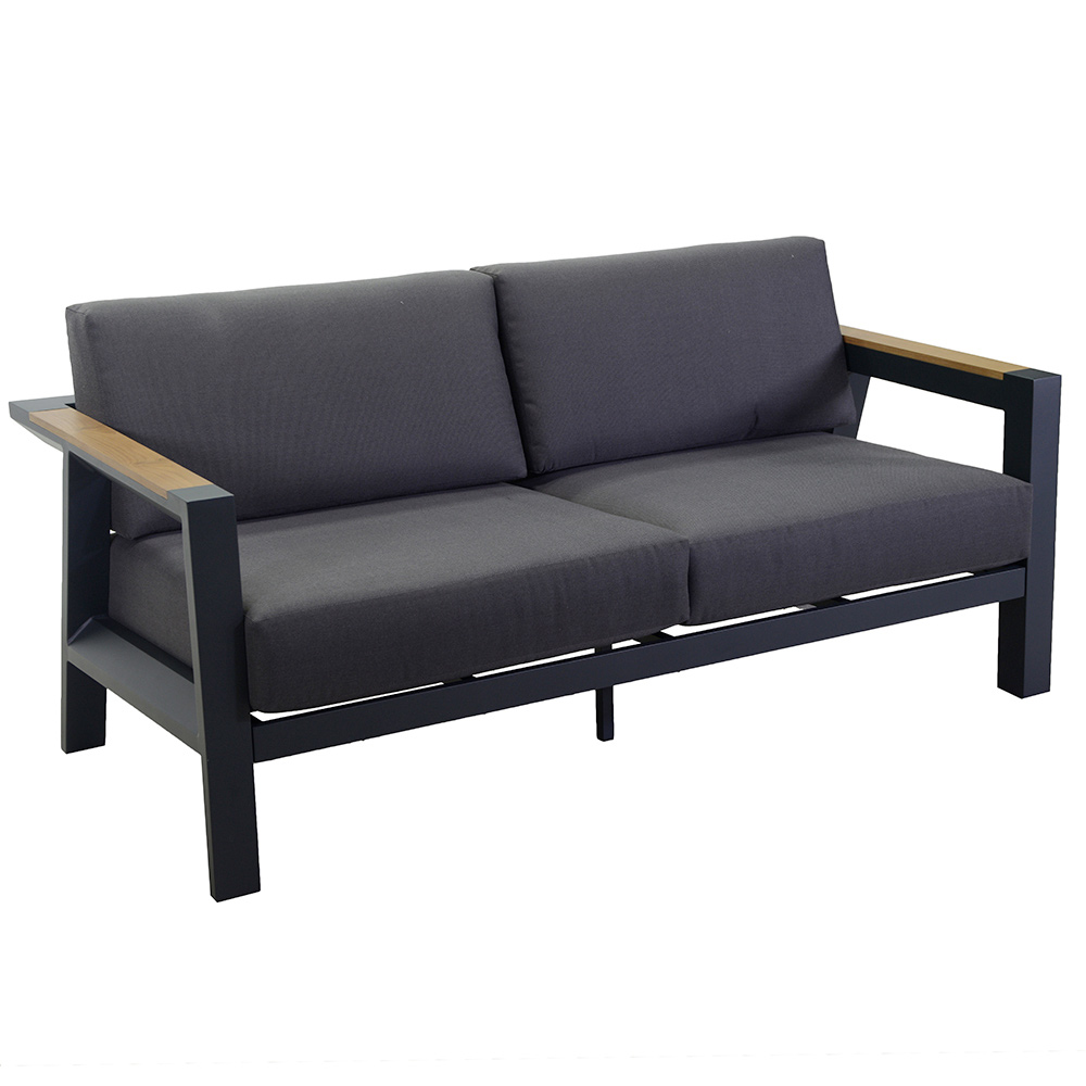 1 sofá: estructura en aluminio con recubrimiento en polvo antioxidante en color antracita, cojines hidrófugos en poliéster gris oscuro, fundas extraíbles y reposabrazos en madera TEAK de Brasil