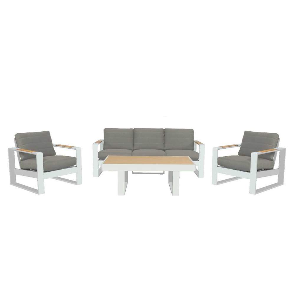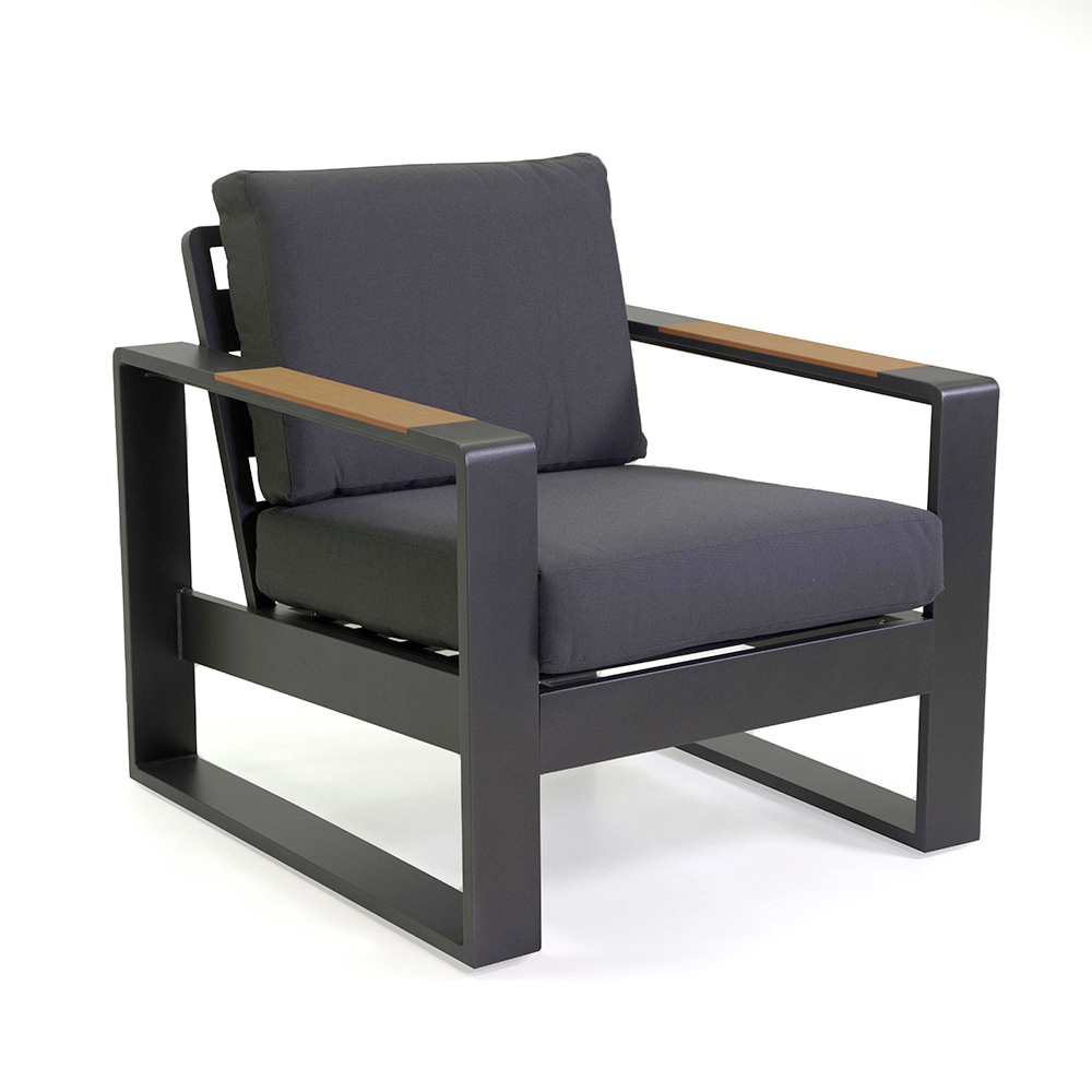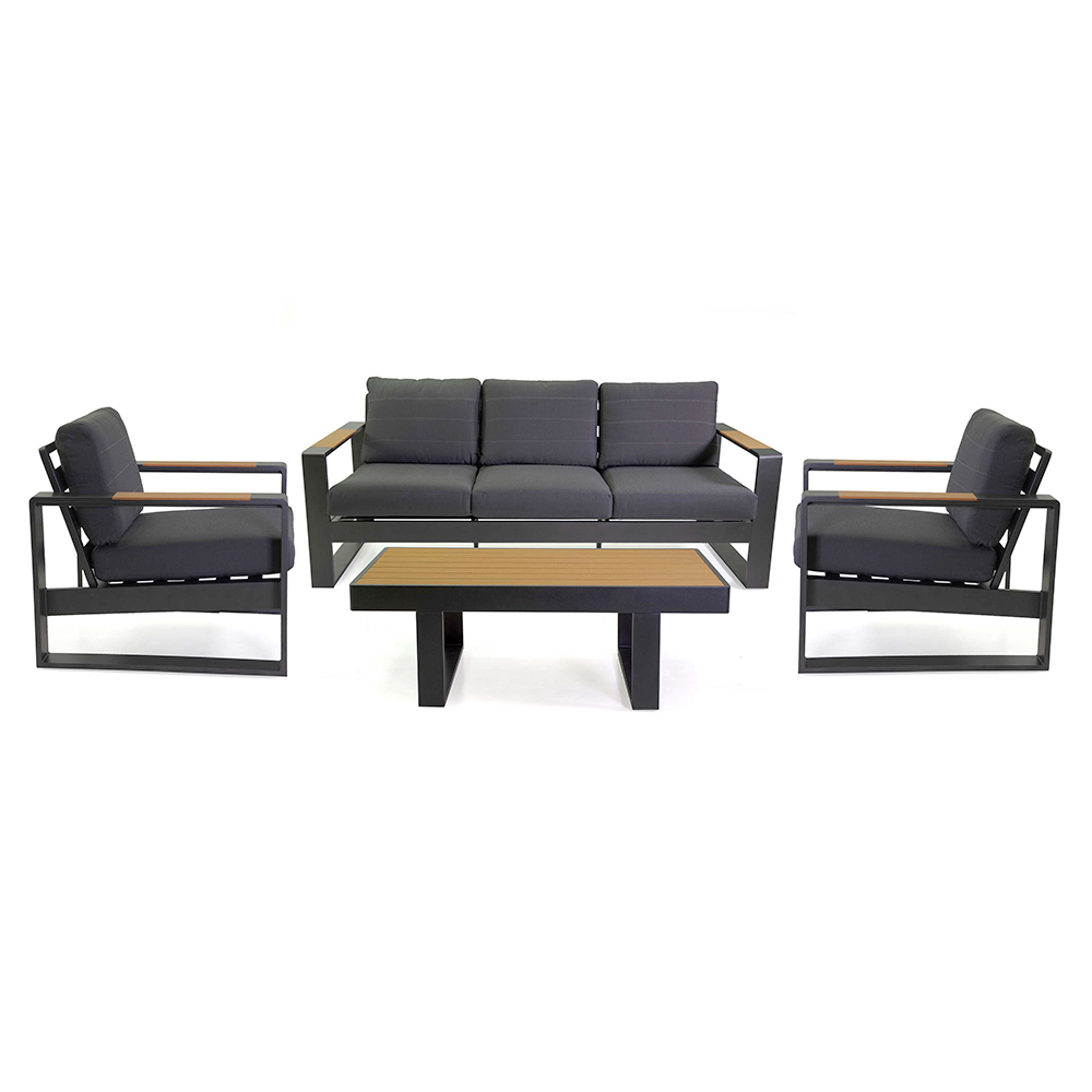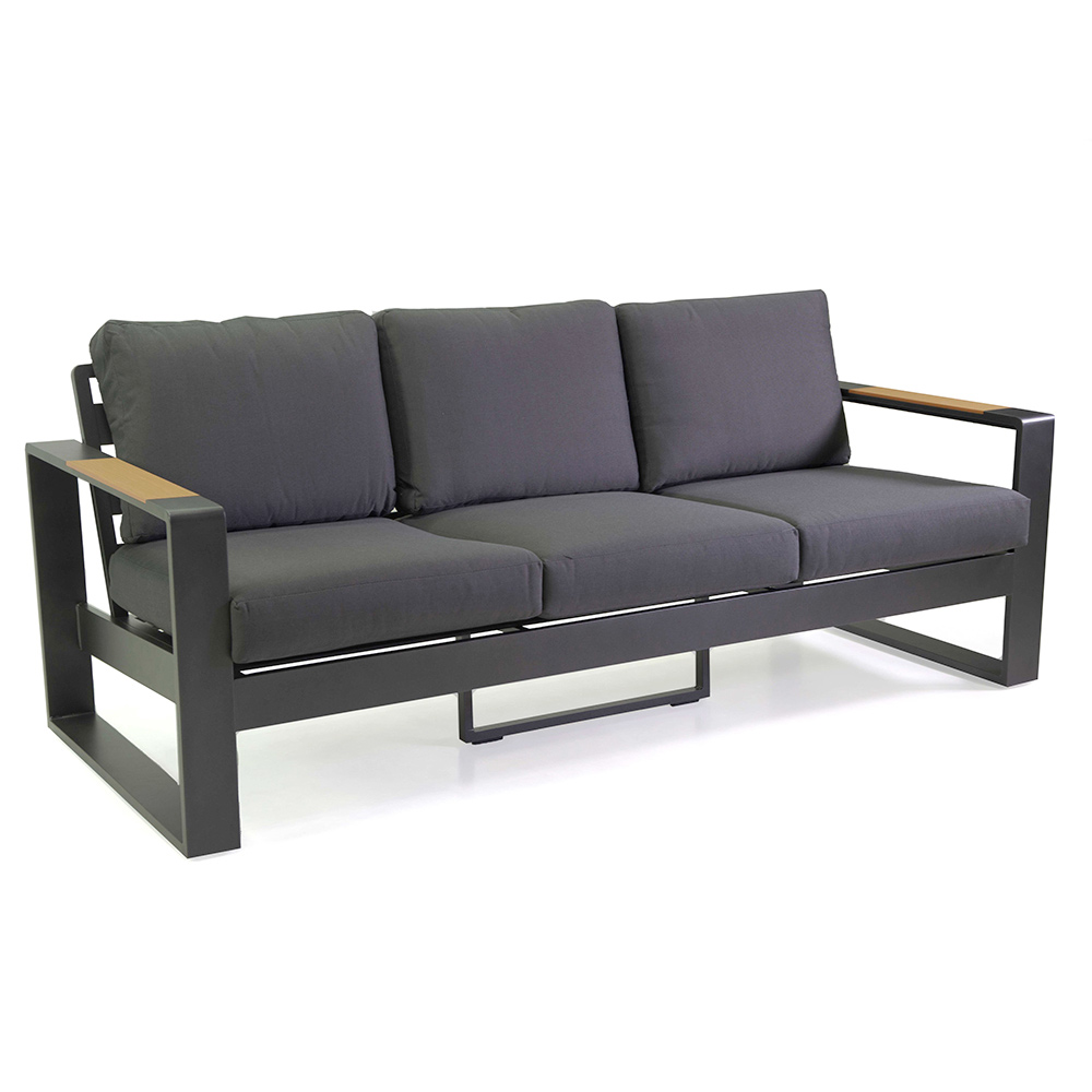 1 sofá: estructura de aluminio con recubrimiento de polvo, cojines de poliéster y apoyabrazos de polywood con efecto madera natural.