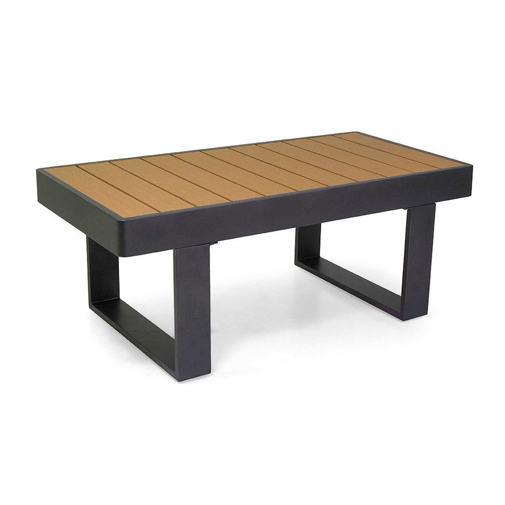 1 mesa de centro: estructura de aluminio con recubrimiento de polvo y tablero de polywood con efecto de madera natural.