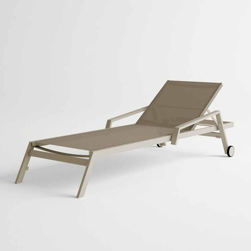 Tumbona exterior, estructura de aluminio y textil, diseño moderno con ruedas y reposabrazos.