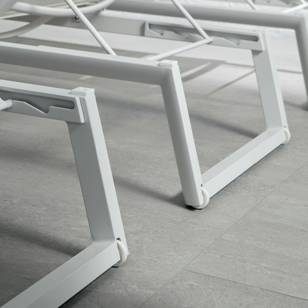 Tumbona de exterior con estructura de aluminio pintado con polvo epoxi combinado con la malla textilene con respaldo reclinable hasta en 4 posiciones con ruedas retráctiles, excelente para asegurar una gran movilidad a este producto.