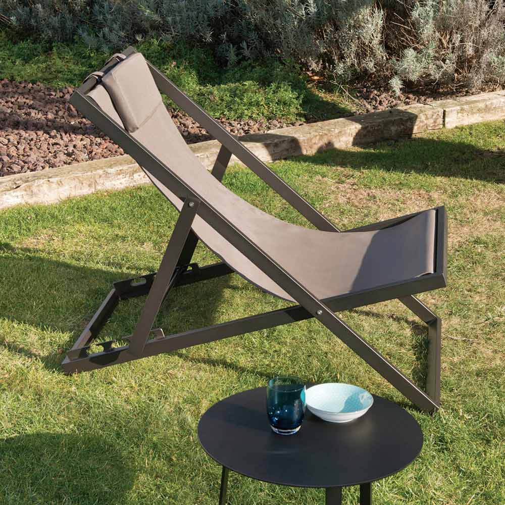 Tumbona de exterior con estructura de aluminio pintado con polvos epoxi y asiento de textileno de 2 piezas.