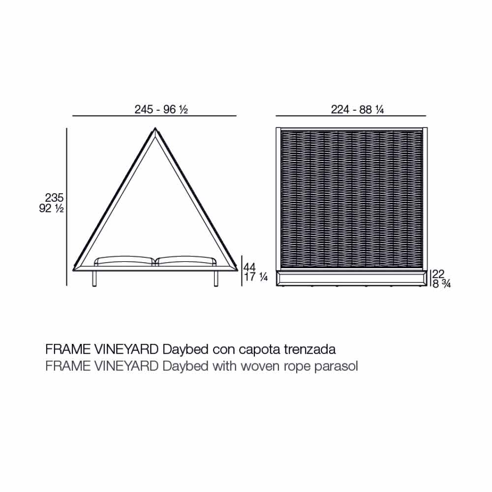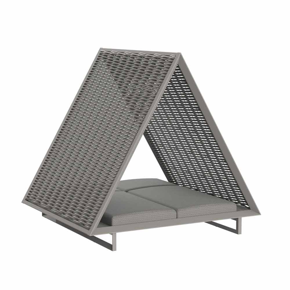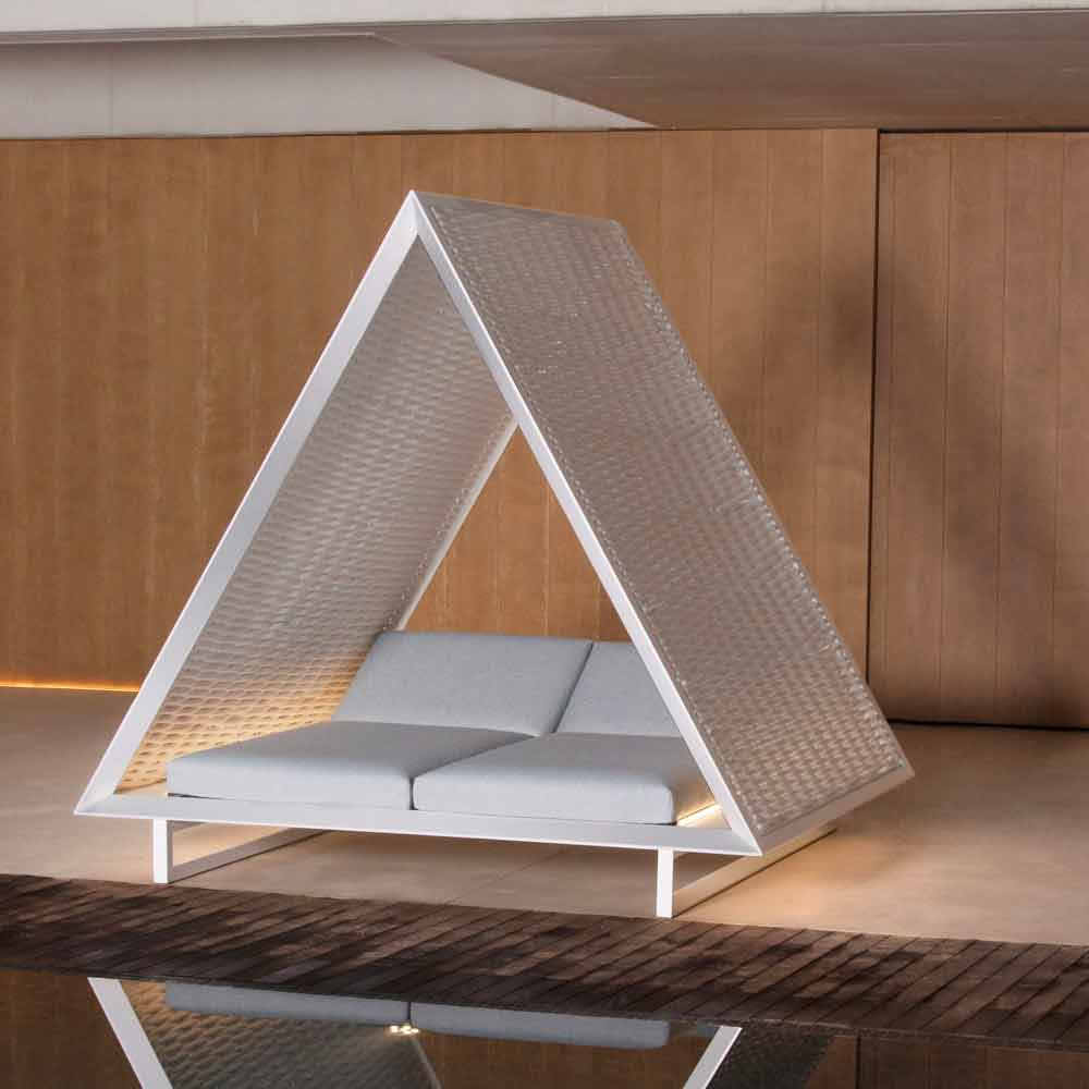 Tumbona de exterior doble, de diseño lujoso y elegante con estructura de aluminio y parasol de cuerda trenzada.