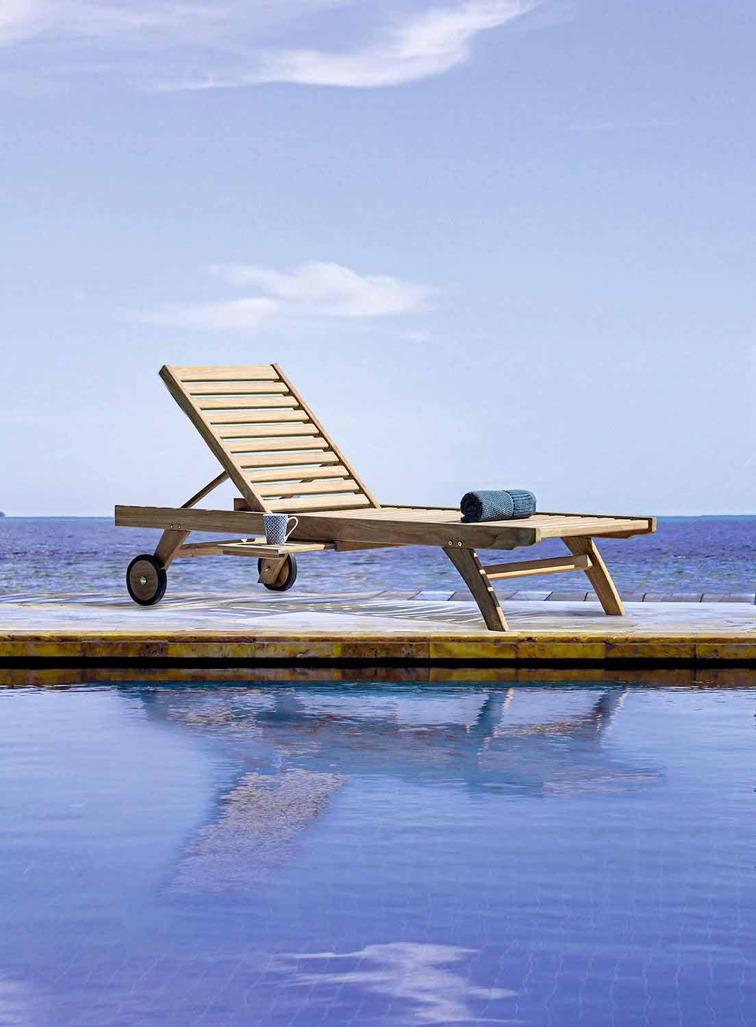 Tumbona de diseño exterior con ruedas, compartimento reclinable y de almacenamiento en madera de teca.