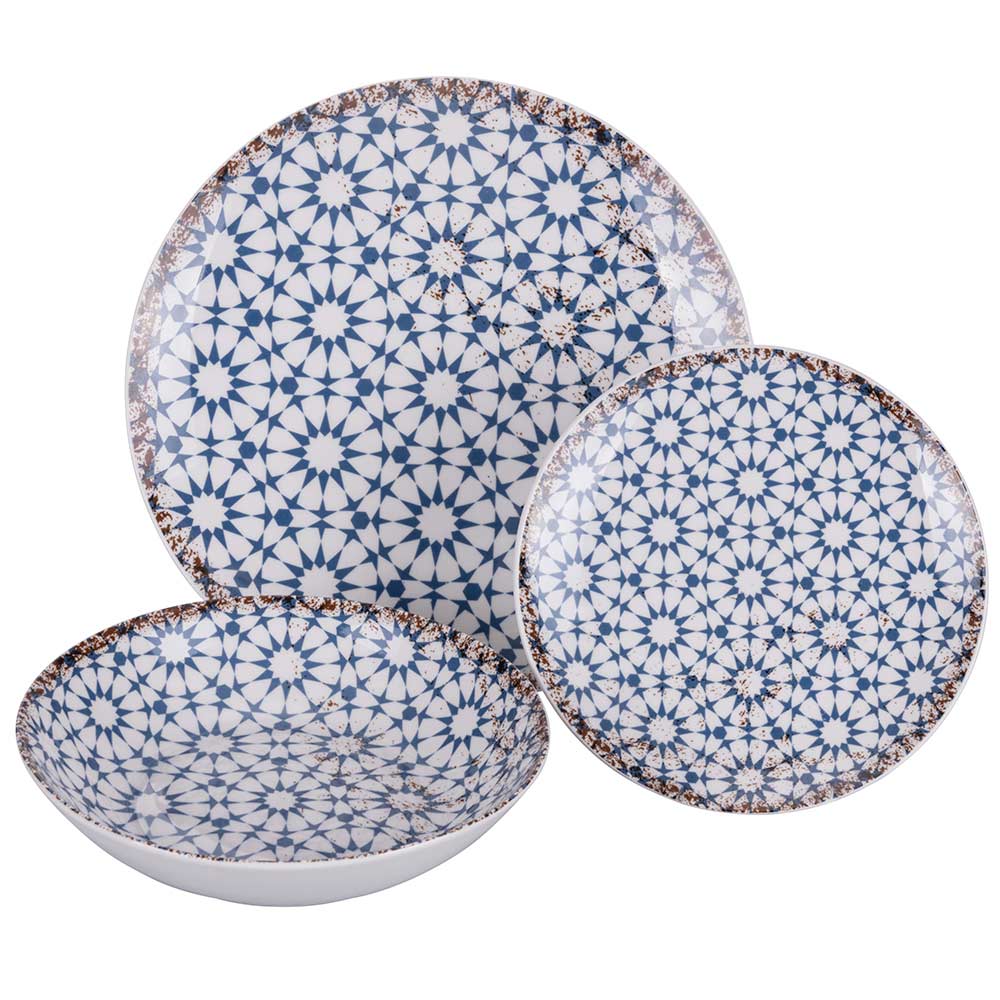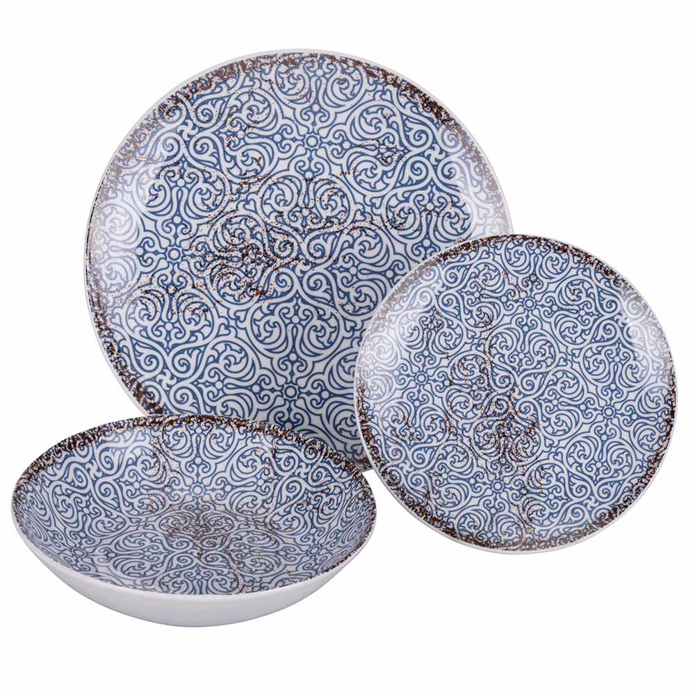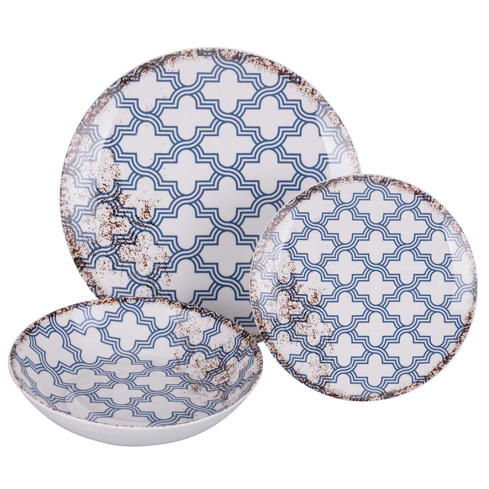 Déjate fascinar por este juego de 18 platos de porcelana , un canto a la belleza clásica con un toque de modernidad. Cada plato cuenta con un diseño intrincado , que recuerda a la fina cerámica de Delft, que se entrelaza en un mosaico de patrones que hablan el lenguaje de la elegancia atemporal.