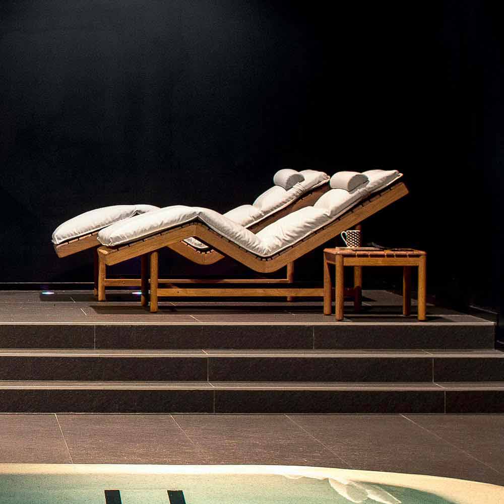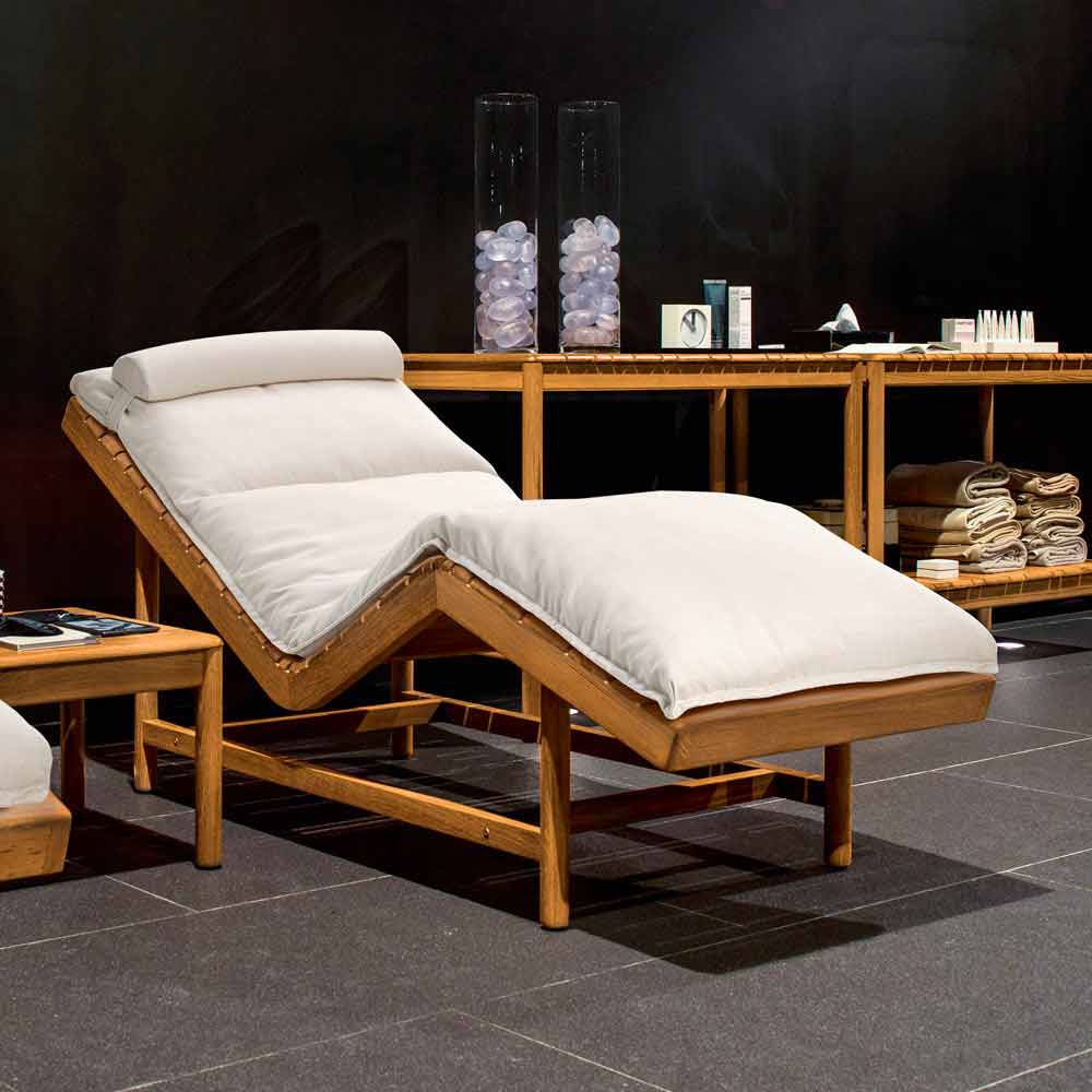 La tumbona Barcode se puede utilizar tanto en el interior como en el exterior y está compuesta por una estructura de madera de teca con un cojín de 194x70xH8 cm y un cojín para el reposacabezas de 60x14xH7 cm (completamente extraíble).