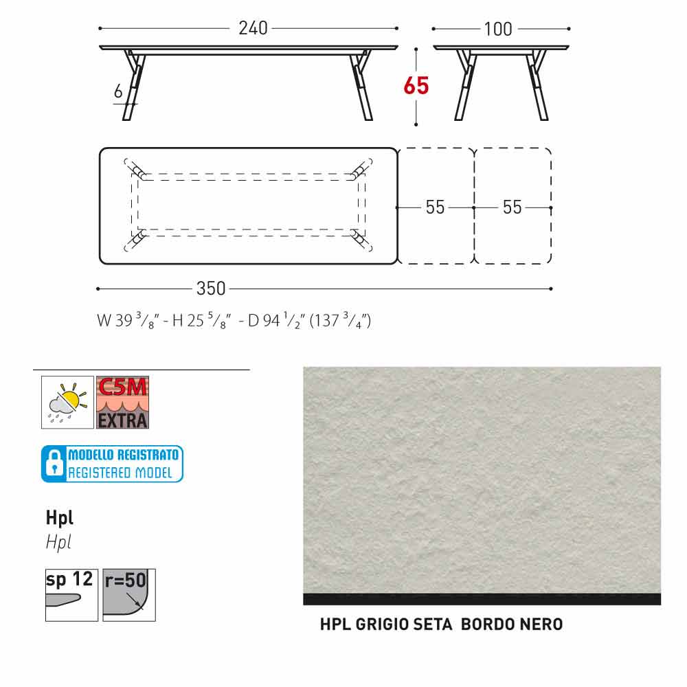 Características: HPL laminados de alta presión. Se componen de varias capas de papel (70%) impregnado con resinas termoendurecibles (30%), y se compacta a través de la acción combinada del calor (alrededor de 150 grados) y alta presión (superior a 7 MPa) durante aproximadamente 45-50 minutos. El resultado es una densidad estable, no reactivo, no poroso y de alta, con características físicas y químicas de alta resistencia mecánica (controlado excursión térmica 80; -40 grados, en tiempo limitado de menos de 30 segundos a temperaturas extremas), la exposición a la luz y la exposición a los cambios de temperatura, incluso en ambientes marinos.