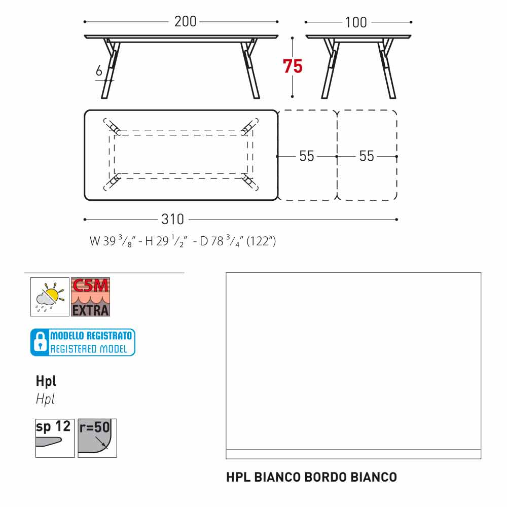 100x200 / 310xH75 cm - 2 55 cm extensiones cada