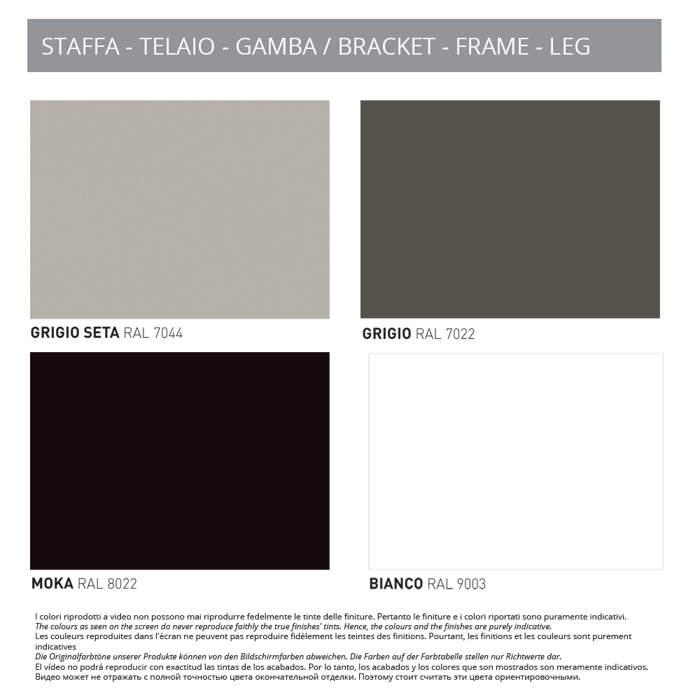 Cómo elegir el acabado: seleccione el tamaño deseado y la variante superior en el menú desplegable. Visualice la carta de colores e indique el código del acabado deseado para la estructura y las patas en la casilla correspondiente.