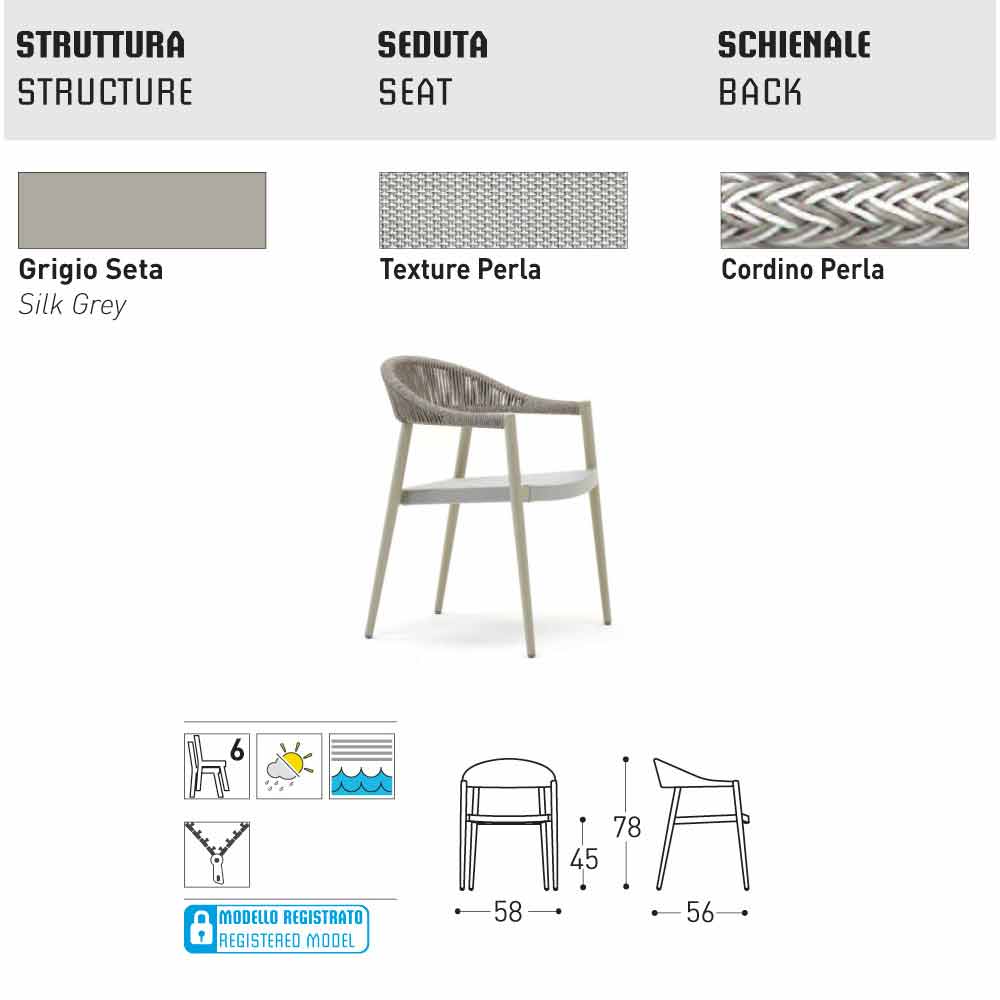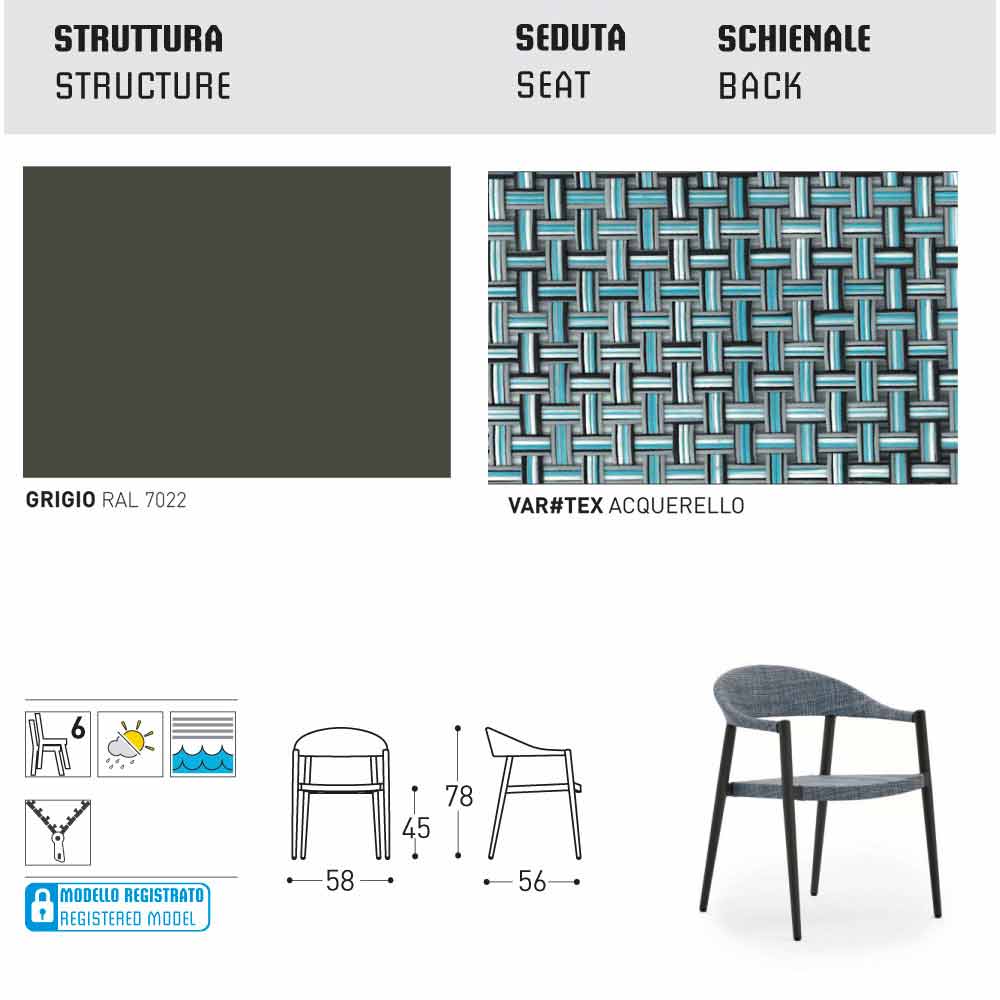 Colección con marco de aluminio, asiento y respaldo en la textura perforada en diferentes colores o en VAR # TEX. También versión disponible con la espalda en la cuerda de seguridad.