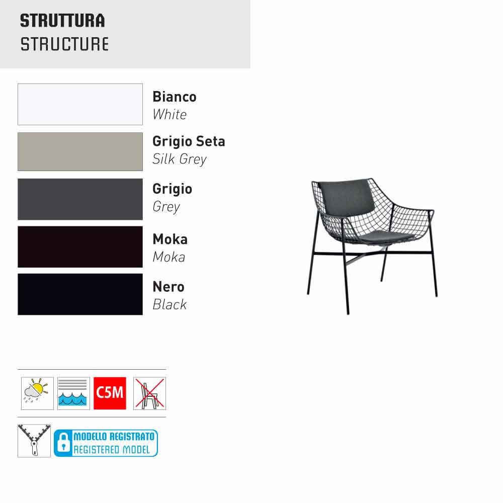 Sillón de tela con estructura de acero con recubrimiento de polvo. Modelo registrado. Summer Set es un sillón extremadamente versátil que se puede usar tanto en exteriores como para completar ambientes interiores. Viene con cojín de asiento y cojín de respaldo.
