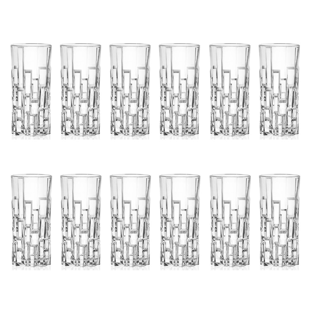 Vasos altos de cristal ecológico con decoración de tallas, 12 piezas fabricadas en Italia.