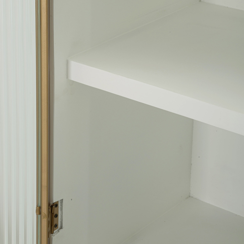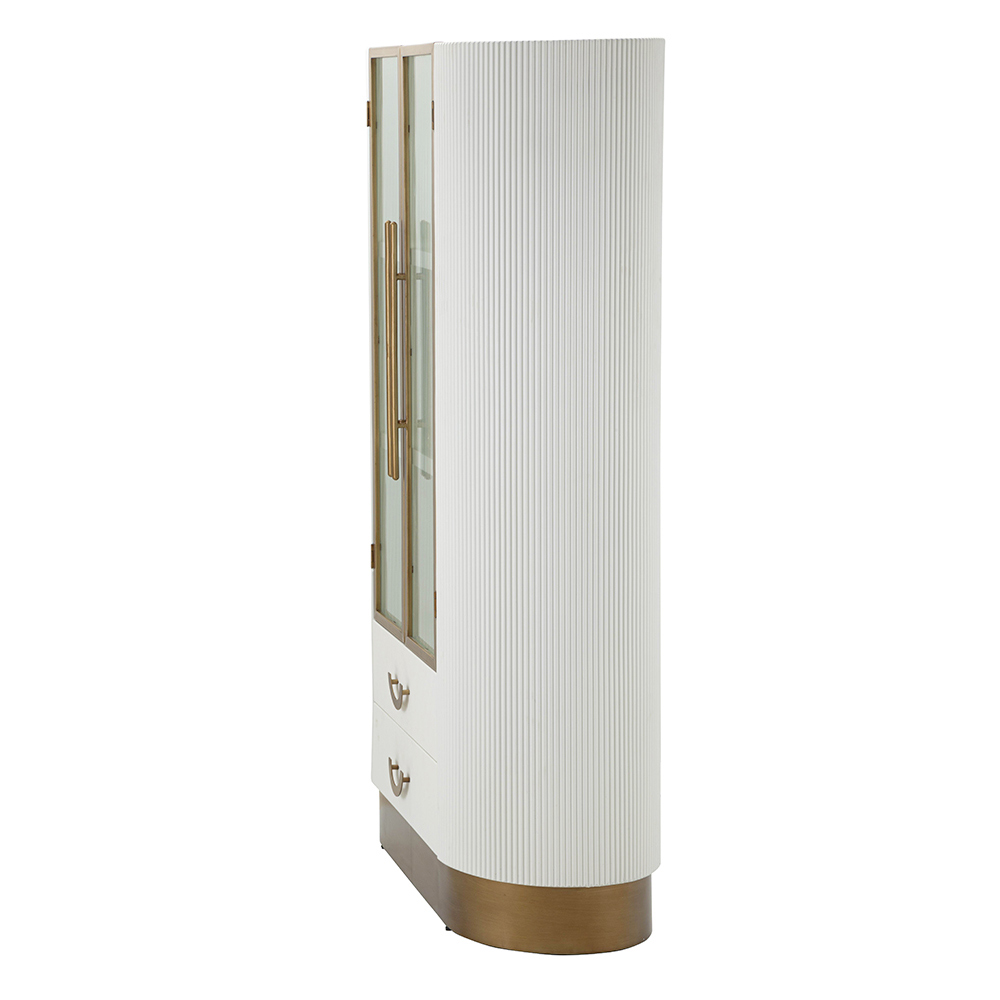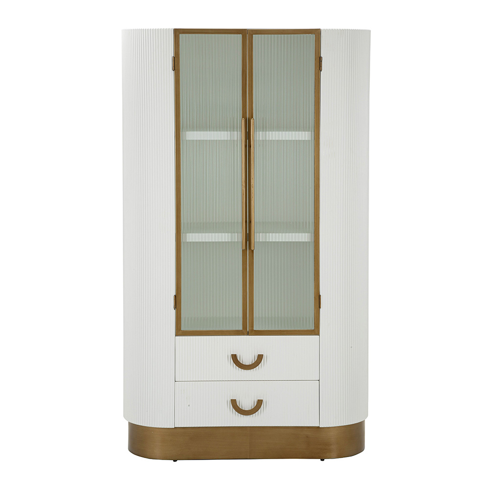 El acabado blanco con detalles ranurados verticales da un toque de textura y profundidad visual, mientras que las líneas de la base y los tiradores introducen un cálido contraste que eleva aún más el mueble. Sus formas redondeadas aportan una suavidad única a los ambientes, al tiempo que ofrecen un generoso espacio de almacenamiento, organizado de forma práctica con estantes internos y amplios cajones.