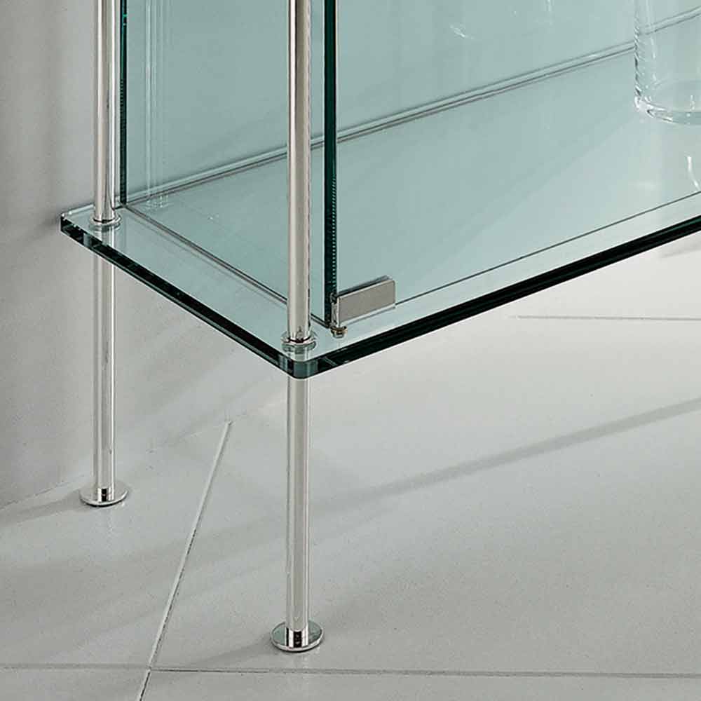 La vitrina de dos puertas está fabricada íntegramente en vidrio templado transparente con cierre y soportes metálicos de acero inoxidable.